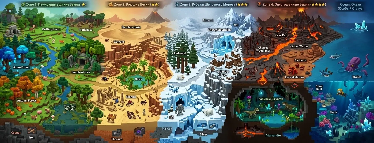 Исследуйте мир Hytale — нажмите на любую зону, чтобы узнать о биомах, существах, ресурсах и секретах.